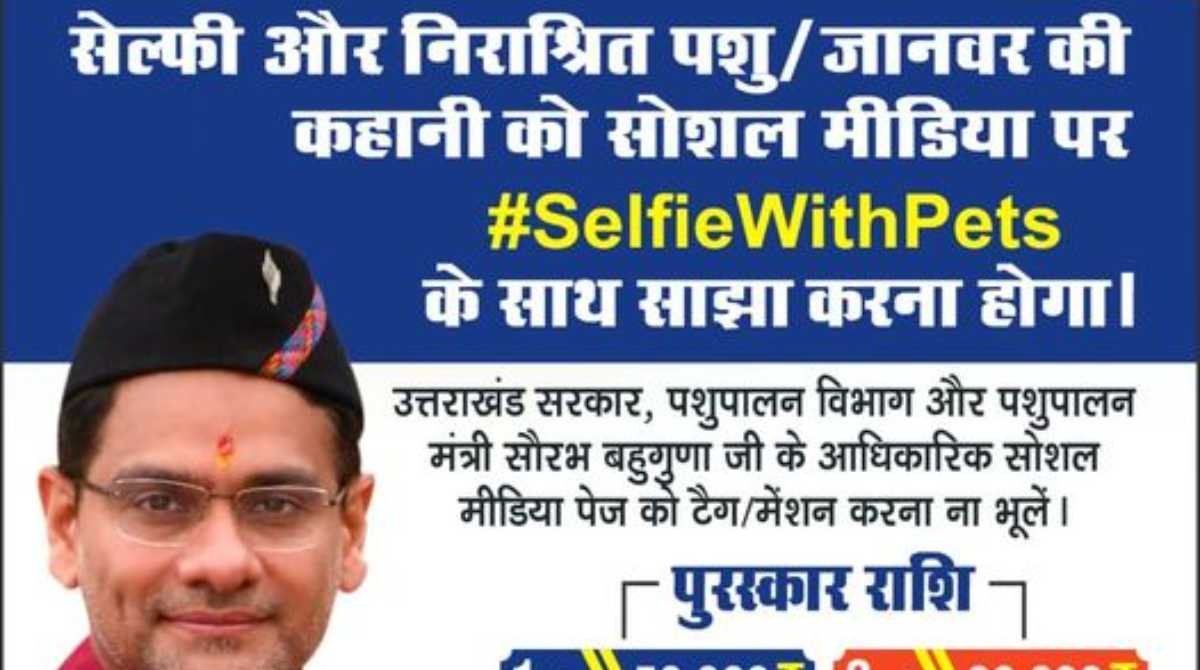 बताया जा रहा है कि पशुपालन विभाग, उत्तराखंड ने निराश्रित जानवरों के प्रति प्रेम भाव बढ़ाने और हमारे बेजुबान प्राणियों के लिए धरती को बेहतर जगह बनाने के उद्देश्य से #selfiewithpets कैंपेन की शुरूआत की है। इस कैंपेन में हिस्सा लेने के लिए आपको बस पालतू जानवरों के साथ सेल्फी खिंचकर कहानी के साथ #SelfieWithPets हैसटैग के साथ सोशल मीडिया पर शेयर करनी है। इस कैंपेन में पुरस्कार राशि 1st 50,000 ₹ 2nd 30,000 ₹ 3rd 15,000 ₹ रुपए रखी गई है।