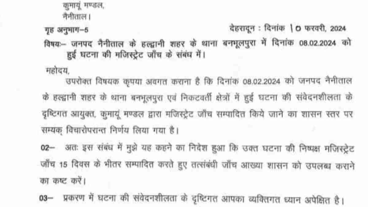 01- जनपद नैनीताल के हल्द्वानी शहर के थाना बनभूलपुरा एवं निकटवर्ती क्षेत्रों में हुई घटना की संवेदनशीलता के दृष्टिगत आयुक्त, कुमायूं मण्डल द्वारा मजिस्ट्रेट जाँच सम्पादित किये जाने का शासन स्तर पर सम्यक् विचारोपरान्त निर्णय लिया गया है।