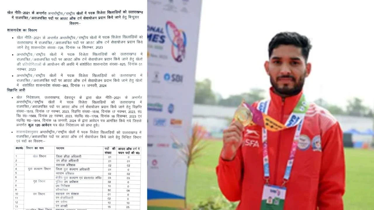 बता दें कि उत्तराखंड में खिलाड़ियों को खेलों के प्रति प्रोत्साहित करने और उनके सुरक्षित भविष्य को लेकर पदक विजेता खिलाड़ियों के लिए धामी सरकार द्वारा सीधे नौकरी की व्यवस्था की गई है। जिसके तहत खेल निदेशालय, उत्तराखण्ड, देहरादून के द्वारा खेल नीति-2021 के अन्तर्गत अन्तर्राष्ट्रीय/राष्ट्रीय खेलों में पदक विजेता खिलाडियों को उत्तराखण्ड में राजपत्रित/अराजपत्रित पदों पर आउट ऑफ टर्न सेवायोजन प्रदान किये जाने हेतु 156 पदों पर विज्ञप्ति निकाली गई थी। 120 पदक विजेता खिलाड़ियों ने नौकरी के लिए आवेदन किया था, जिनमें से 31 खिलाड़ियों का अंतिम चयन किया गया है। चयनित अभ्यर्थियों के प्रमाण-पत्रों के सत्यापन की कार्यवाही गतिमान है।