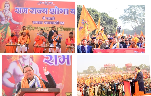मुख्यमंत्री पुष्कर सिंह धामी ने शनिवार को परेड ग्राउंड देहरादून में श्री राम मंदिर प्राण प्रतिष्ठा उत्सव समिति, द्वारा आयोजित “राम राज्य शोभायात्रा“ कार्यक्रम में प्रतिभाग किया इस दौरान मुख्यमंत्री पुष्कर सिंह धामी ने कहा कि सभी राम भक्तों का 500 से अधिक वर्ष का इंतजार खत्म होकर भव्य राम मंदिर बनने का सपना पूरा हो रहा है। हजारों साधु संतों राम भक्तों, सनातन प्रेमियों के बलिदान के उपरांत इस पुण्य दिन के हम सब साक्षी बनेंगे मुख्यमंत्री ने कहा कि 22 जनवरी को आयोध्या में होने वाले भगवान श्रीराम की मूर्ति की प्राण प्रतिष्ठा के हम सब साक्षी बनेंगे।