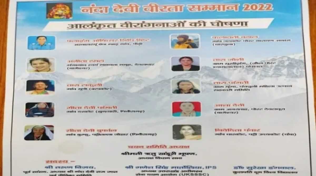 मीडिया रिपोर्टस के अनुसार श्री नंदादेवी राजजात पूर्व पीठिका समिति की ओर से हर साल अलग-अलग क्षेत्रों में उत्कृष्ट कार्य करने वाली महिलाओं को सम्मानित किया जाता है। इस साल वीरता और साहस के क्षेत्र में योगदान देने वाली 10 महिलाओं को सम्मानित किया जाएगा। यह सम्मान समारोह एक नवंबर को आयोजित किया जायेगा।